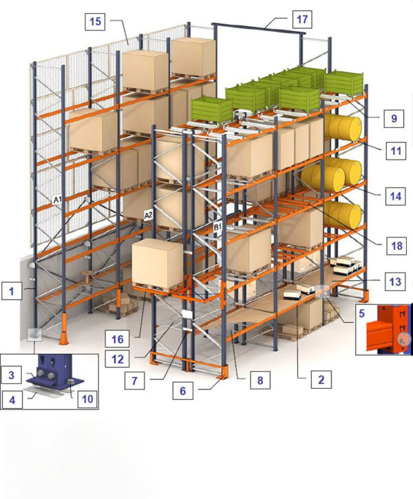 Skladba paletových regálov a doplnky k paletovým regálom: 1. stojka paletového regálu 2. nosník 3. päta stojky 4. vyrovnávacia podložka 5. zabudovaná poistka nosníka 6. ochrana stojky 7. spojka dvoj radu 8. výložník pod drevo triesku 9. výložník pod gitterbox / oceľovú paletu 10. kotviaca skrutka 11. jednoduchý pozicioner pre sudy 12. oceľový rošt 13. […]